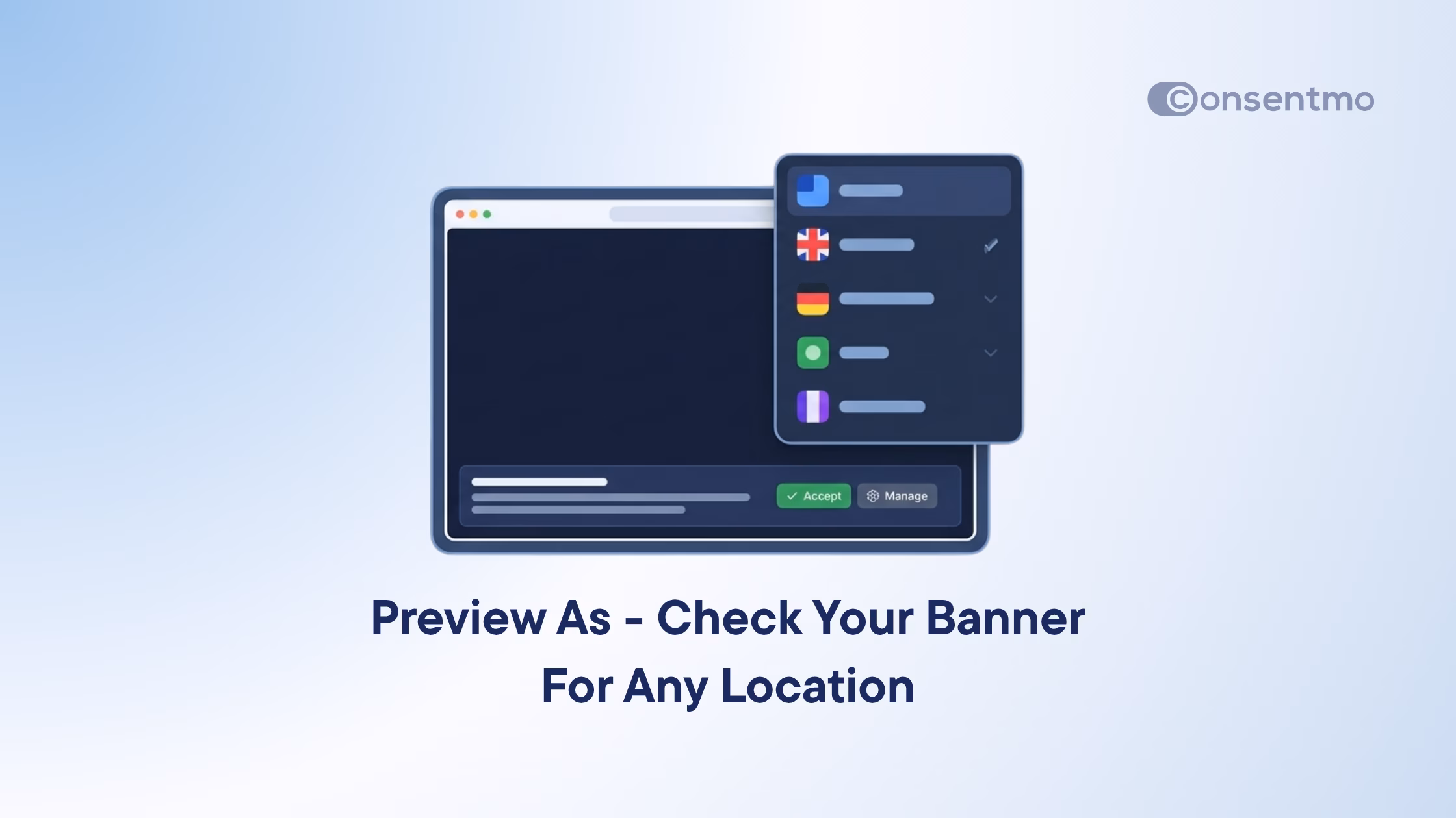 Consentmo's Preview As lets you instantly see how your cookie banner looks and behaves for visitors in any country or US state — no VPN, no test accounts, straight from your dashboard.