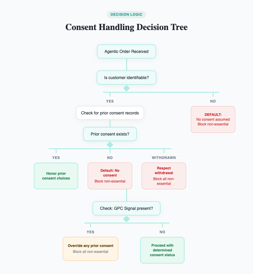 Fourth, apply the default. For new customers or those without prior consent records, block all non-essential processing. Log this as inferred no-consent with the reason noted as agentic channel default.