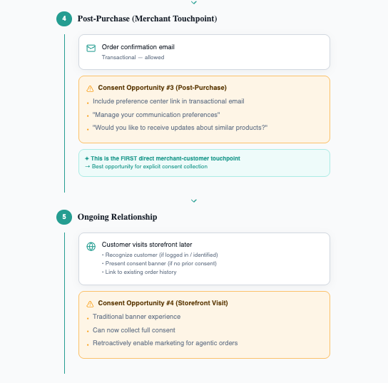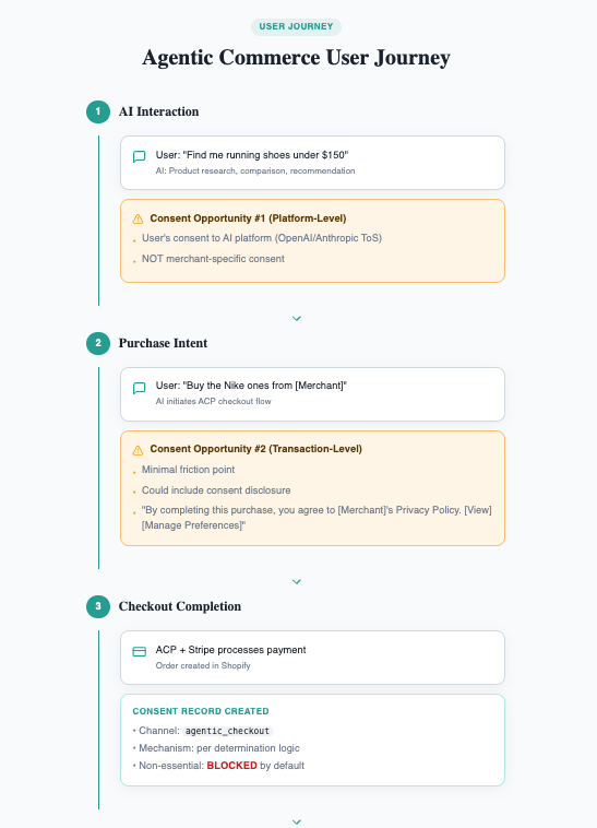 Agentic commerce doesn't eliminate consent collection - it redistributes it across different touchpoints. Understanding this new journey reveals where and how consent can be obtained.