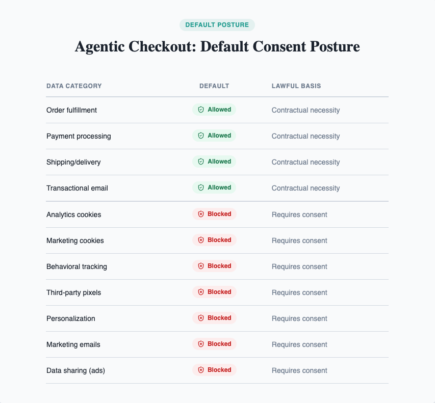 Treat agentic channels as no-consent channels for non-essential data processing by default.