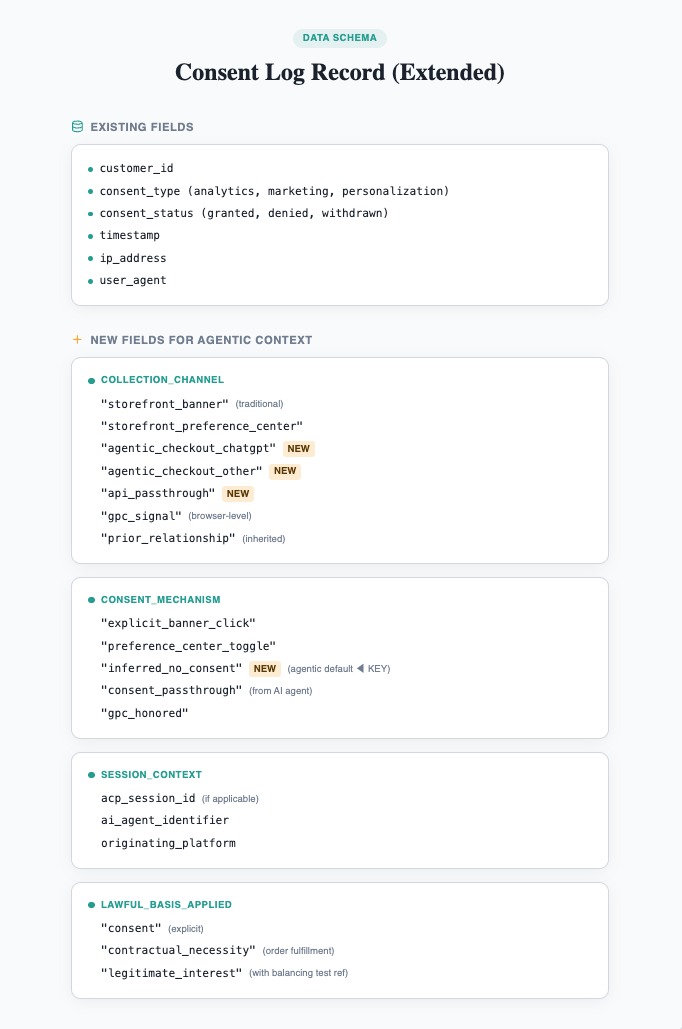 Traditional consent records capture the basics: customer identifier, consent type, status, timestamp, and technical details like IP address and user agent. For agentic commerce, this isn't enough.