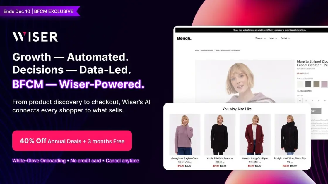Wiser helps Shopify brands boost sales with AI-powered product recommendations, frequently bought together bundles, and smart upsells across store, cart, checkout, and post-purchase pages. Built using Shopify Checkout Extensions, Wiser increases AOV and conversions while offering an advanced analytics dashboard to track ROI, revenue, and performance of each widget in real time.