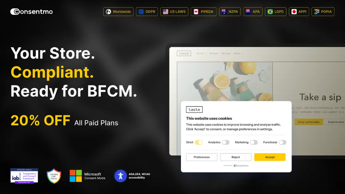 Consentmo, the leading privacy compliance app for Shopify, helps merchants meet global data protection laws like GDPR, CCPA, LGPD, and more - all without slowing down their business. It automates cookie consent, manages data requests, and integrates with Google, Meta, Microsoft, and TikTok to keep your analytics and ads fully compliant.